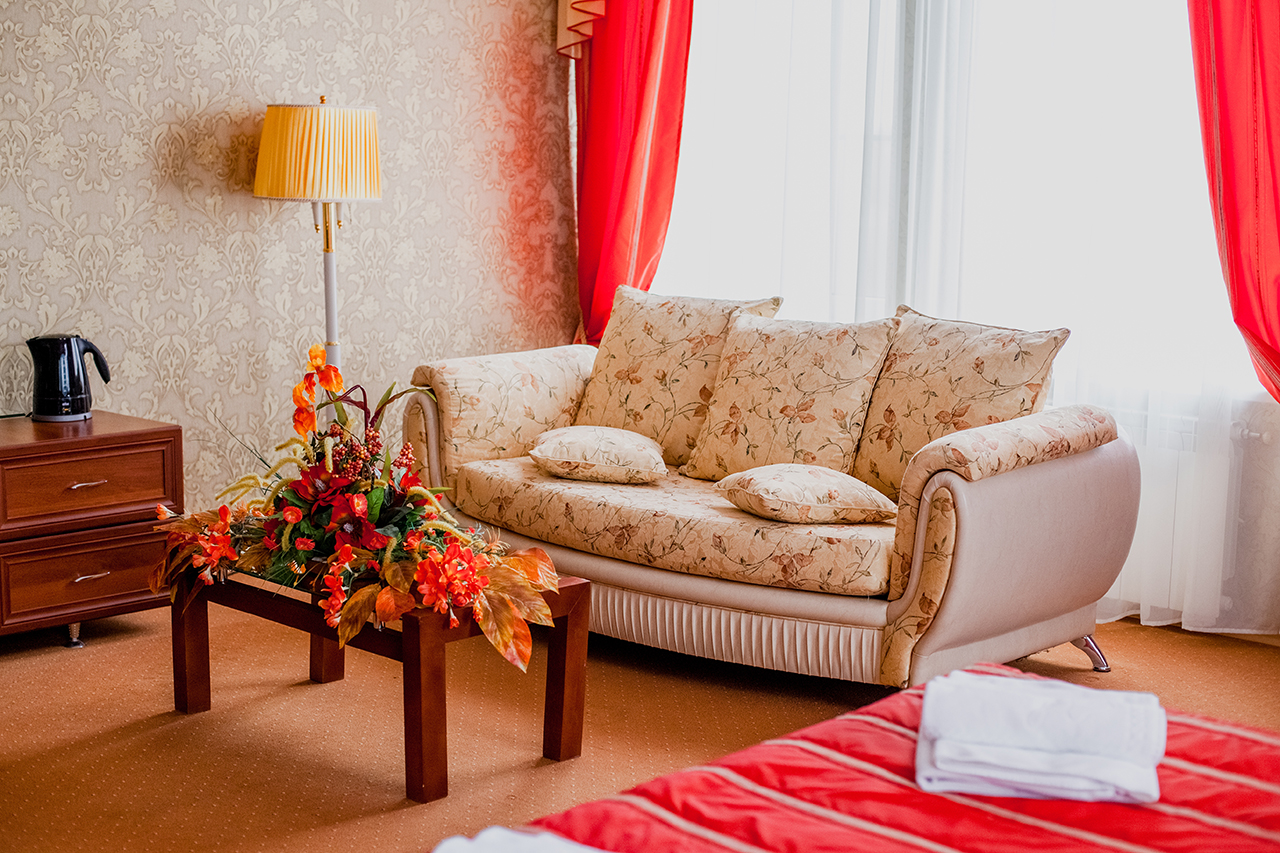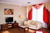 Двухкомнатный номер с гостиной и спальней. Открыв дверь номера, Вы очутитесь в обстановке элегантности и комфорта. В номере созданы все условия как для проведения деловых переговоров, так и для неформального общения и отдыха. Площадь номеров 40,7 м2.