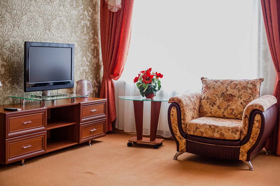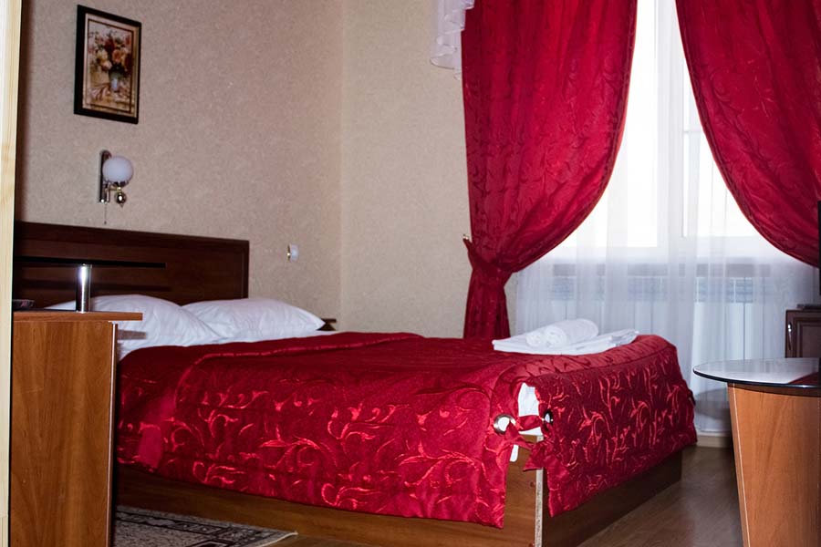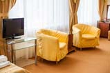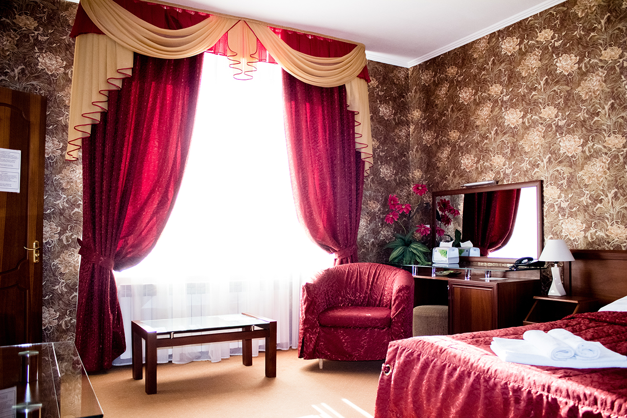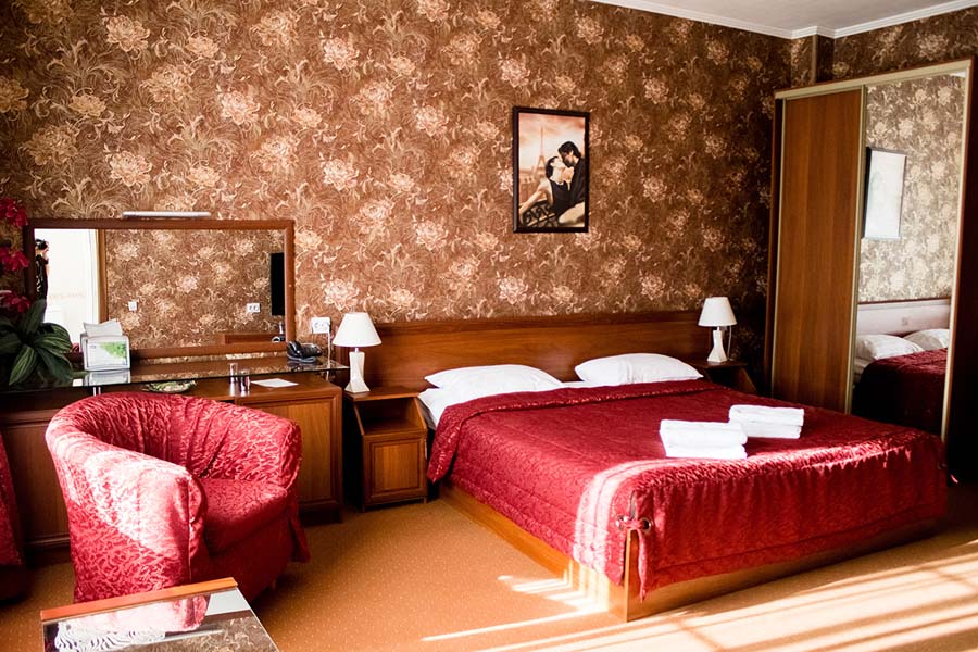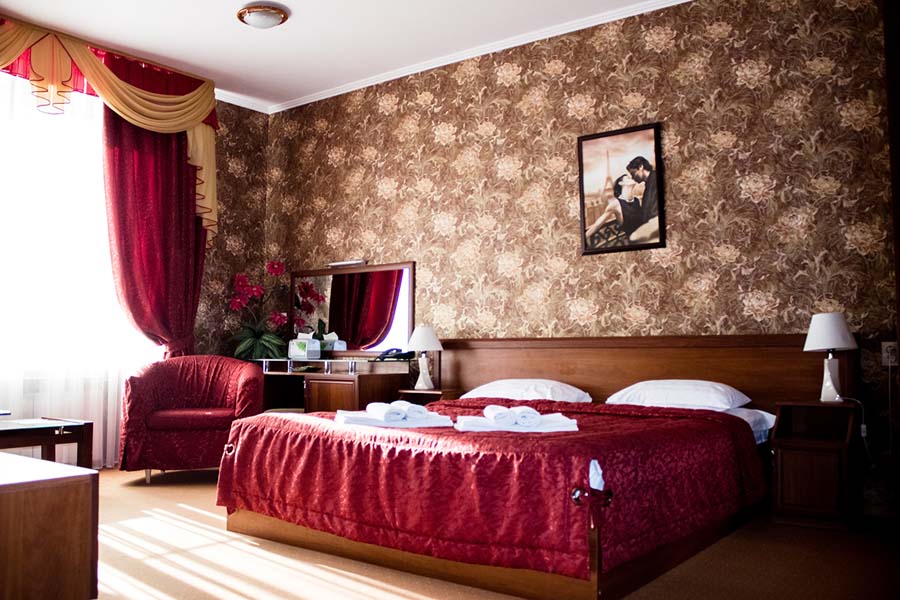 Большая двуспальная кровать (стоимость номера 4300 руб.) или две односпальные кровати (стоимость номера 4700 руб.), мягкое кресло, сплит-система, рабочее место, ЖК-телевизор, спутниковое телевидение, мини-бар, холодильник, прямая междугородняя и международная связь, сейф, ванная комната с душем и профессиональным феном.